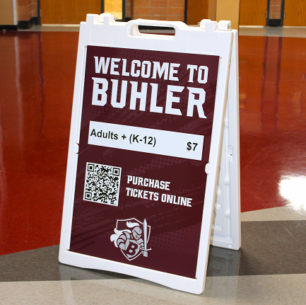 In the first phase of the project, the goal was to improve wayfinding for fans attending Buhler High School football games by providing clear, easy-to-read directional signage to concessions and restrooms from high-traffic areas of the stadium. We addressed this need with three durable A-frame Signs that could be easily moved in and out of storage between games and repurposed for a variety of other school events.