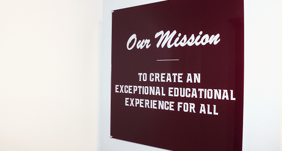 Beginning with the entry wall, we installed an acrylic sign with standoff hardware featuring the school’s mission statement, creating an immediate sense of purpose upon entry.