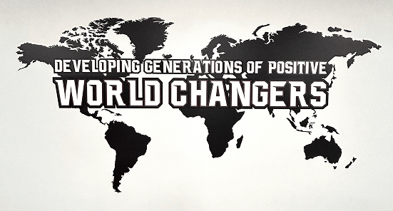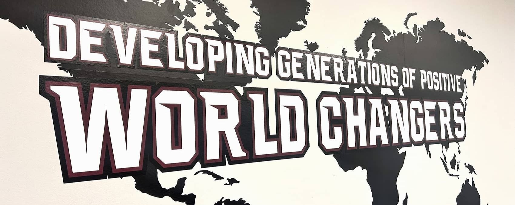 On the center wall of the room, we utilized the existing world map vinyl to tie another statement into the space, layering a vinyl decal that highlights the message “Developing Generations of World Changers" over the top of it.